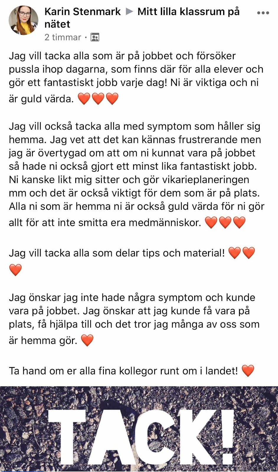 Här hemma har barnen haft skola om dagarna. Elvira har följt sin klass schema och gjort det hon kan hemifrån. Oskar har inte kunnat göra så mycket, men ikväll fick han hem lite böcker så att han kan jobba lite. Vi avvaktar förstås med spänning om det kommer fattas nåt beslut om att stänga skolorna.