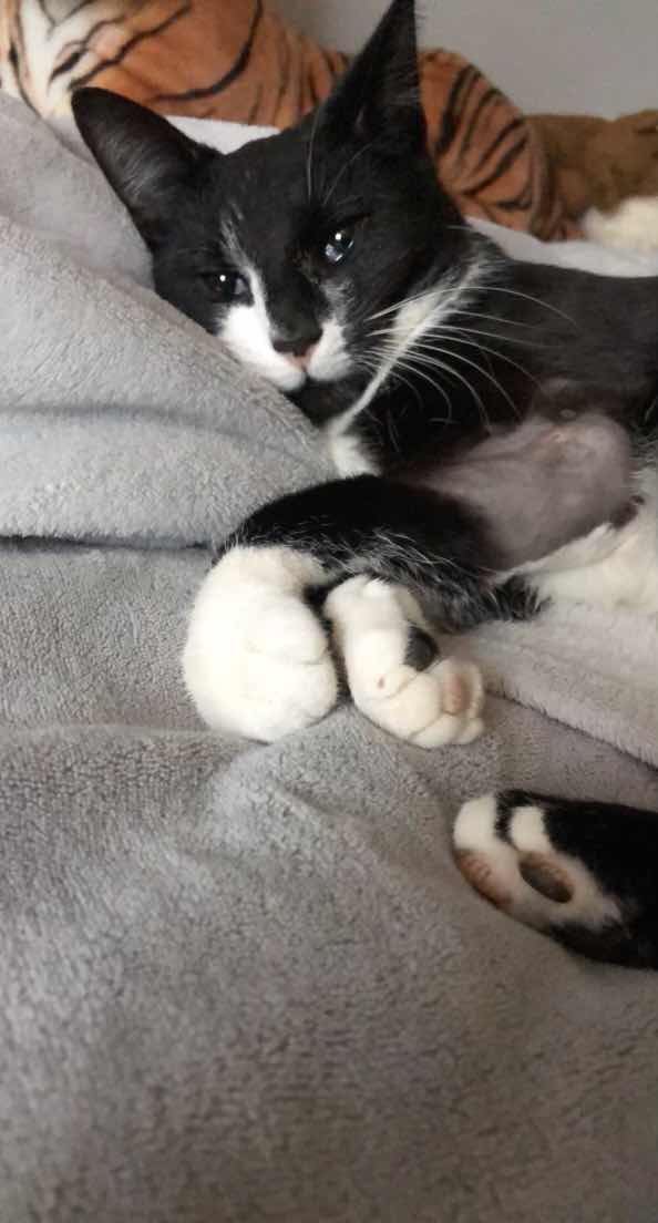 Sen ska han vara stilla och inte hoppa upp och ner på saker, men det går sådär. Vi lånade en hundbur, men han jamade övergivet och började klättra på gallret, så det funkade inte. Elvira försökte övervaka honom i sitt rum en natt och fick knappt sova alls. Han har fått gå runt i huset nu och så har vi försökt lyfta honom när vi ser att han vill upp eller ner.