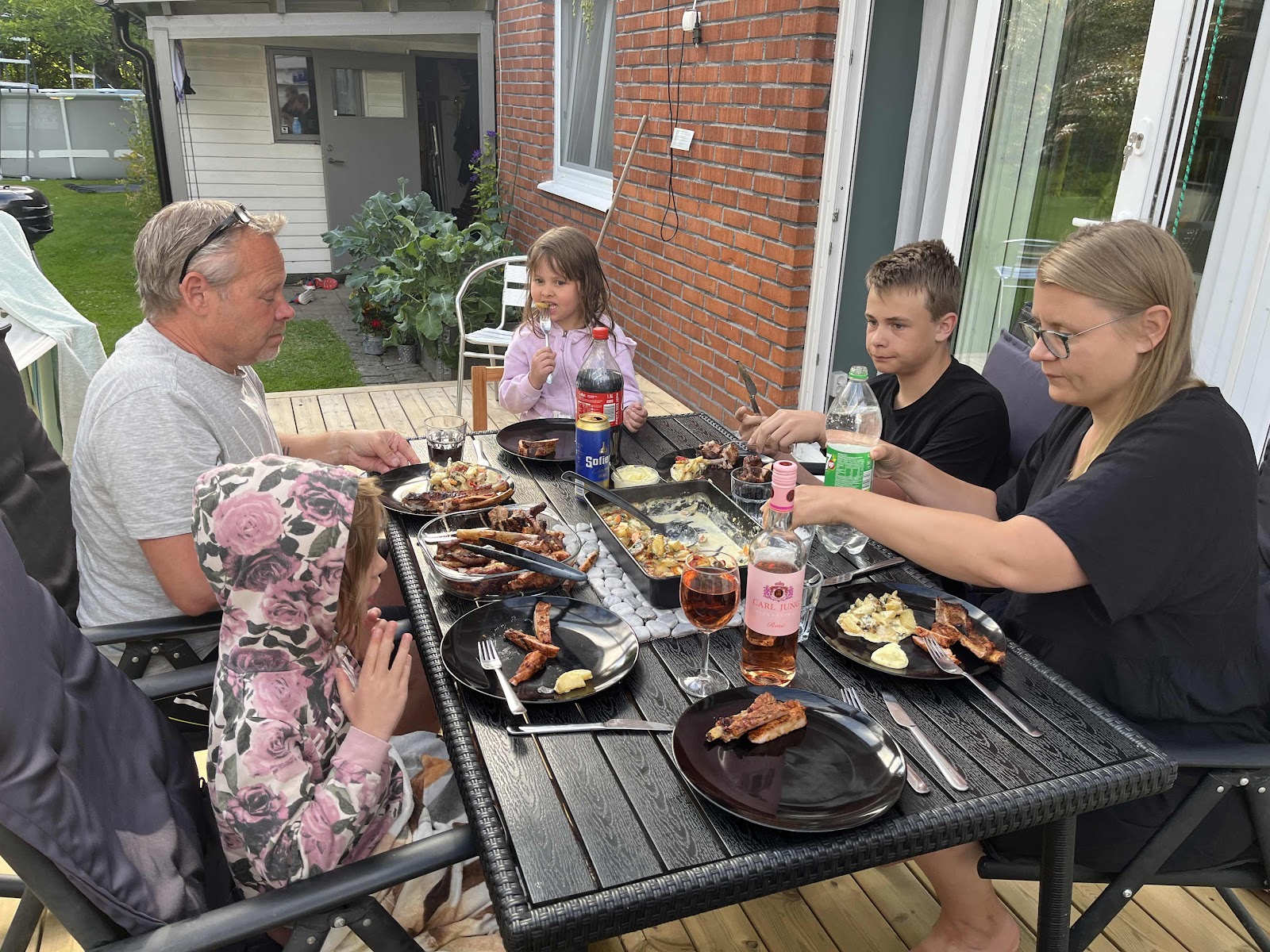 Vi kunde sitta ute och äta kvällsmat, grillat och Agnes gratäng!