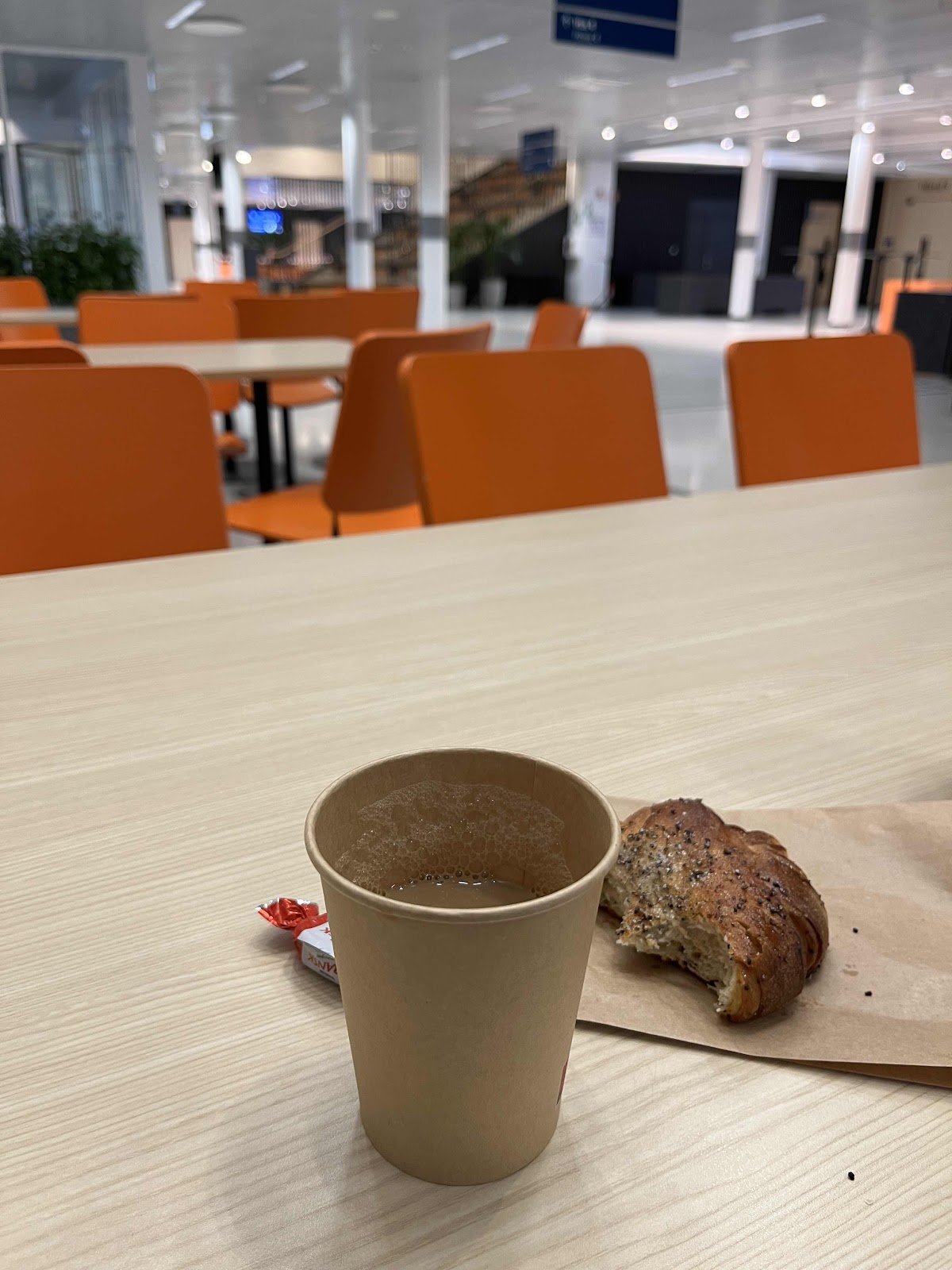Frukosten var också en sorglig historia. En påse med fralla, yoghurt och ägg. Kaffe utan mjölk. Vatten.
