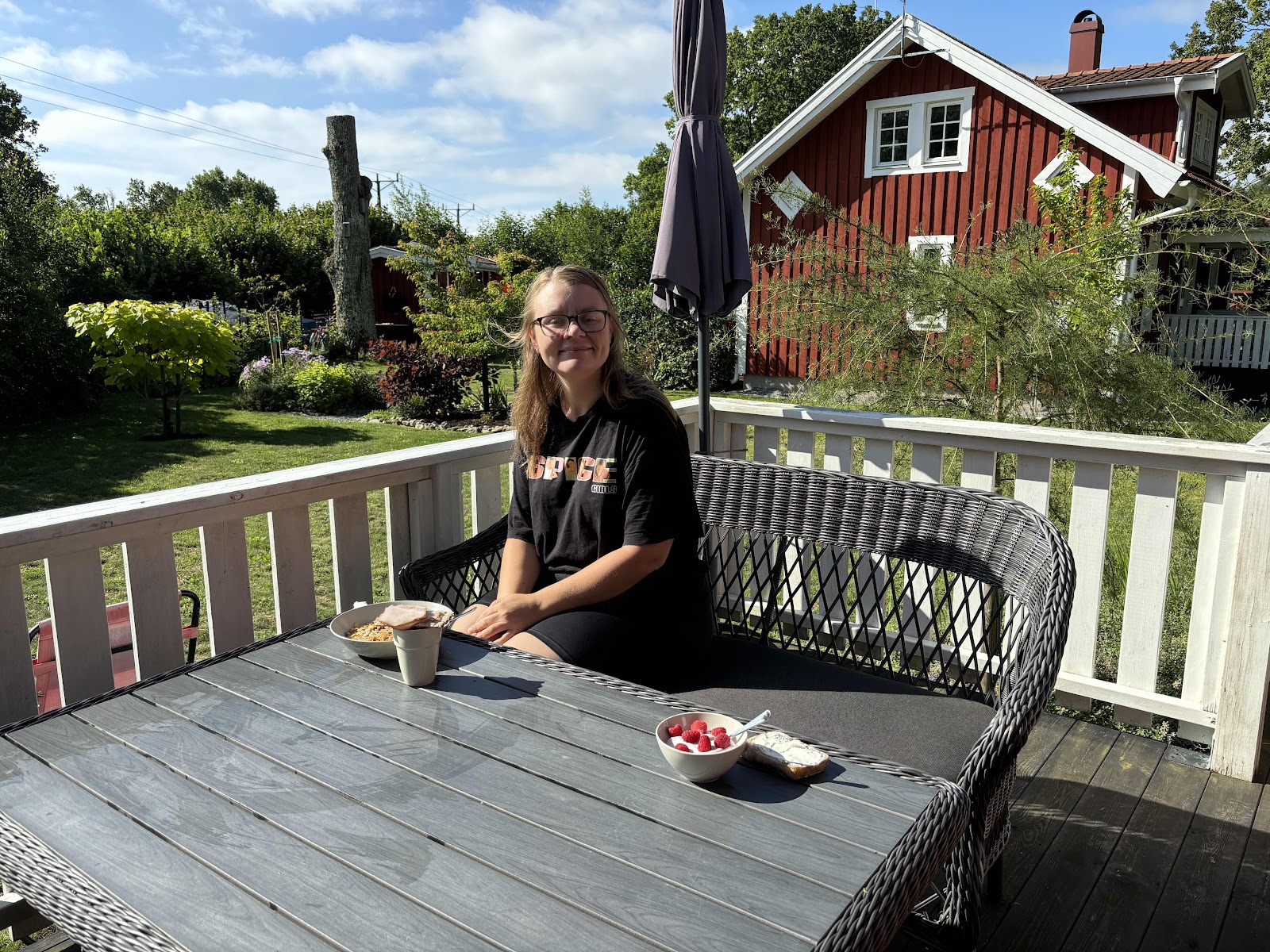 Vi åt kvällsmat på altanen.