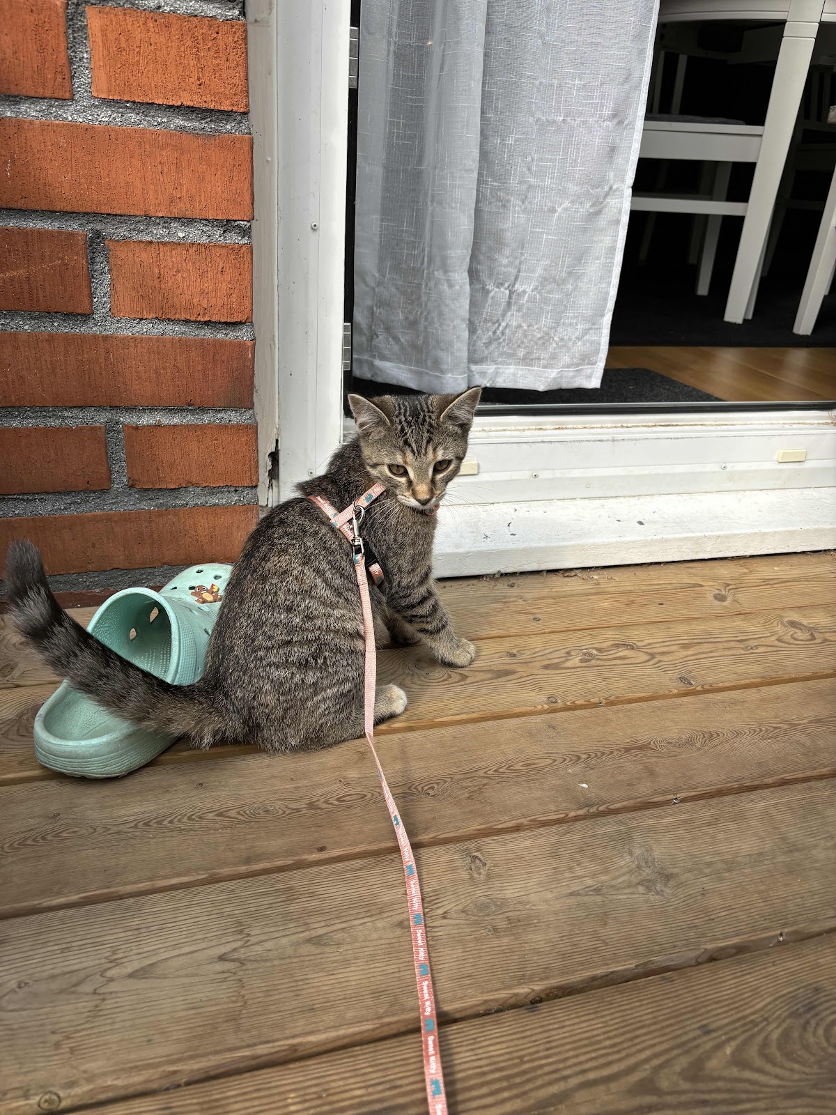 Signe fick gå ut, med sele på. Selen var otäck och ute var läskigt.