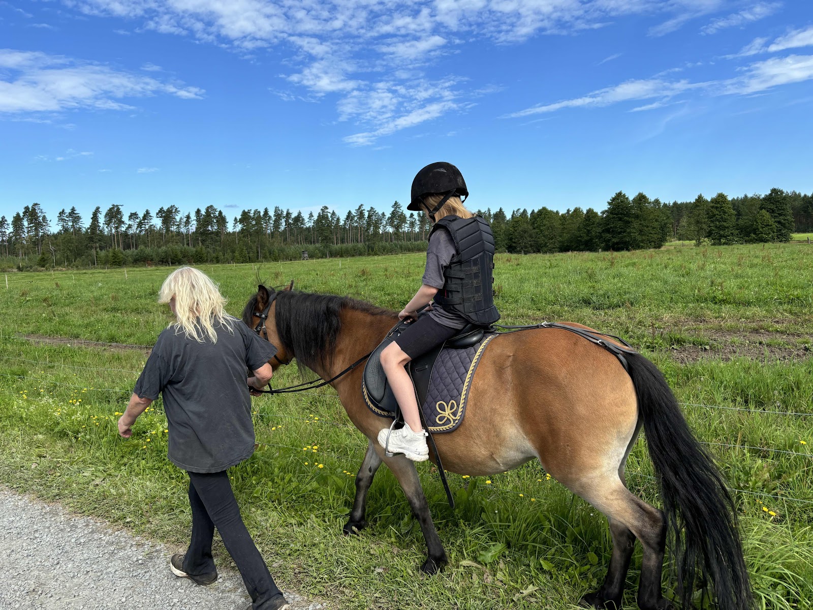 Tisdag förmiddag hälsade vi på Ingmarie och tjejerna fick rida på Dotti! Vi gick en skogspromenad, en fick rida och en fick gå, sen bytte de.