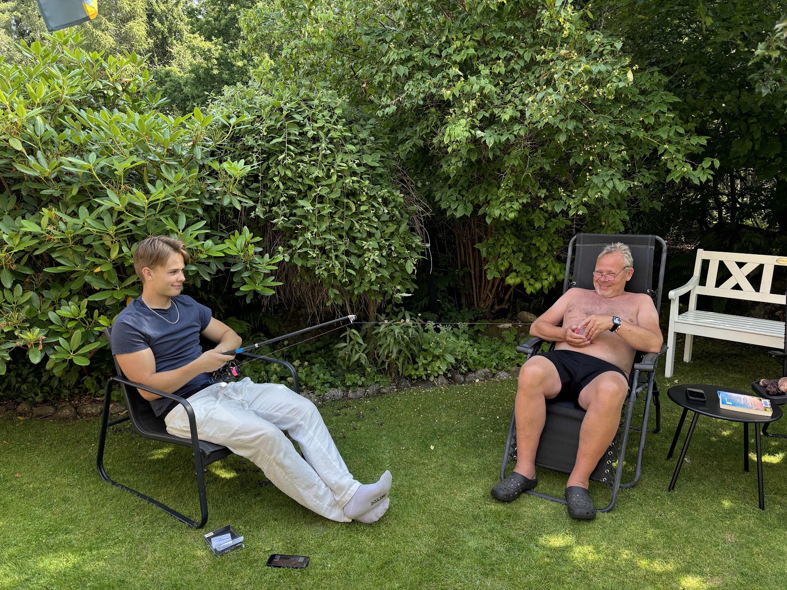 Större delen av dagen tillbringades i skuggan i trädgården, med en bok, virkning och sommarprat. Och ett par dopp i poolen. Oskar, som skulle ut och campa med kompisar på en ö, fixade ny fiskelina på kastspöet.
