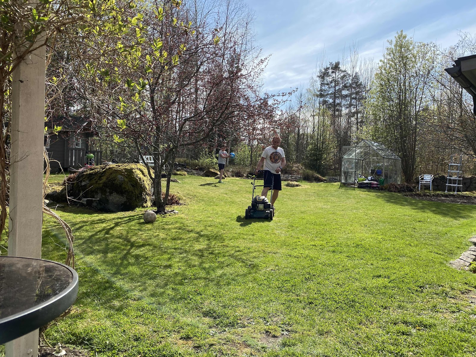 Håkan klippte gräset, Oskar sparkade på sin nya fotboll.