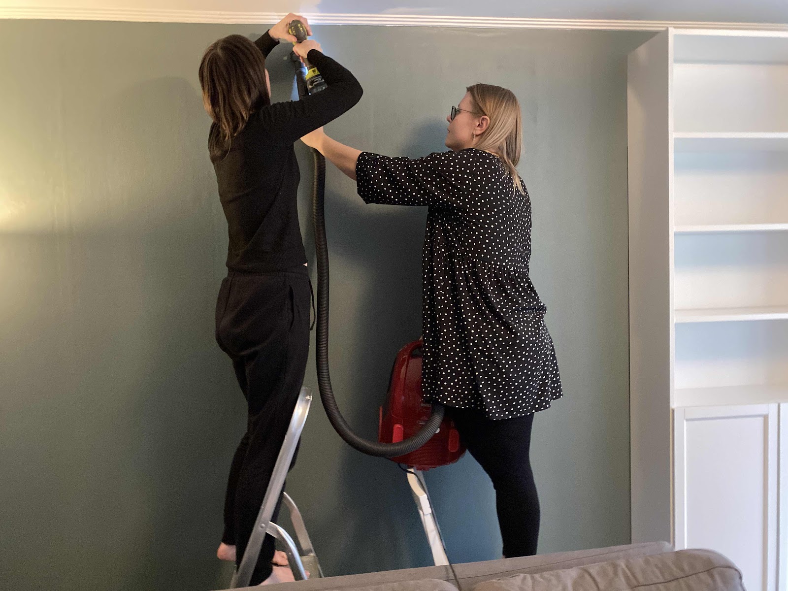 Oskar hjälpte mig att skruva fast luckor på hyllorna. Jag hann skruva fast en hylla i väggen innan det uppstod problem, resten får jag skruva en annan dag.