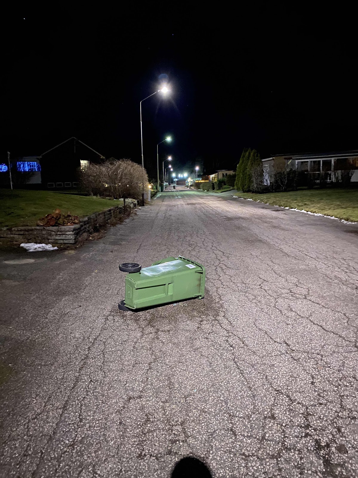 Fredag: Det hade visst blåst lite på natten, jag fick hjälpa grannarna lite med deras soptunnor!