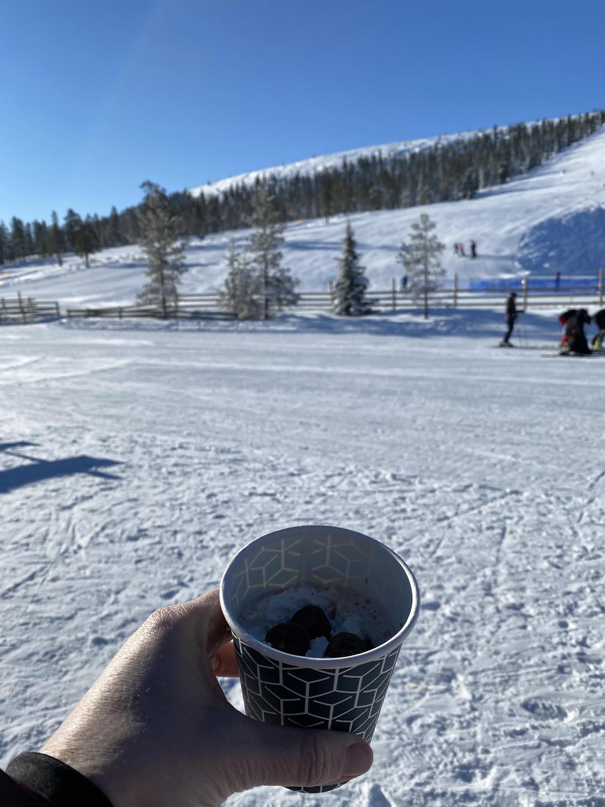 Söndagen bjöd på strålande vackert väder! Oskar hängde på låset i backen, vi andra tog det lugnare. Mathilda, Elvira och jag promenerade ner med lite varm choklad på förmiddagen.