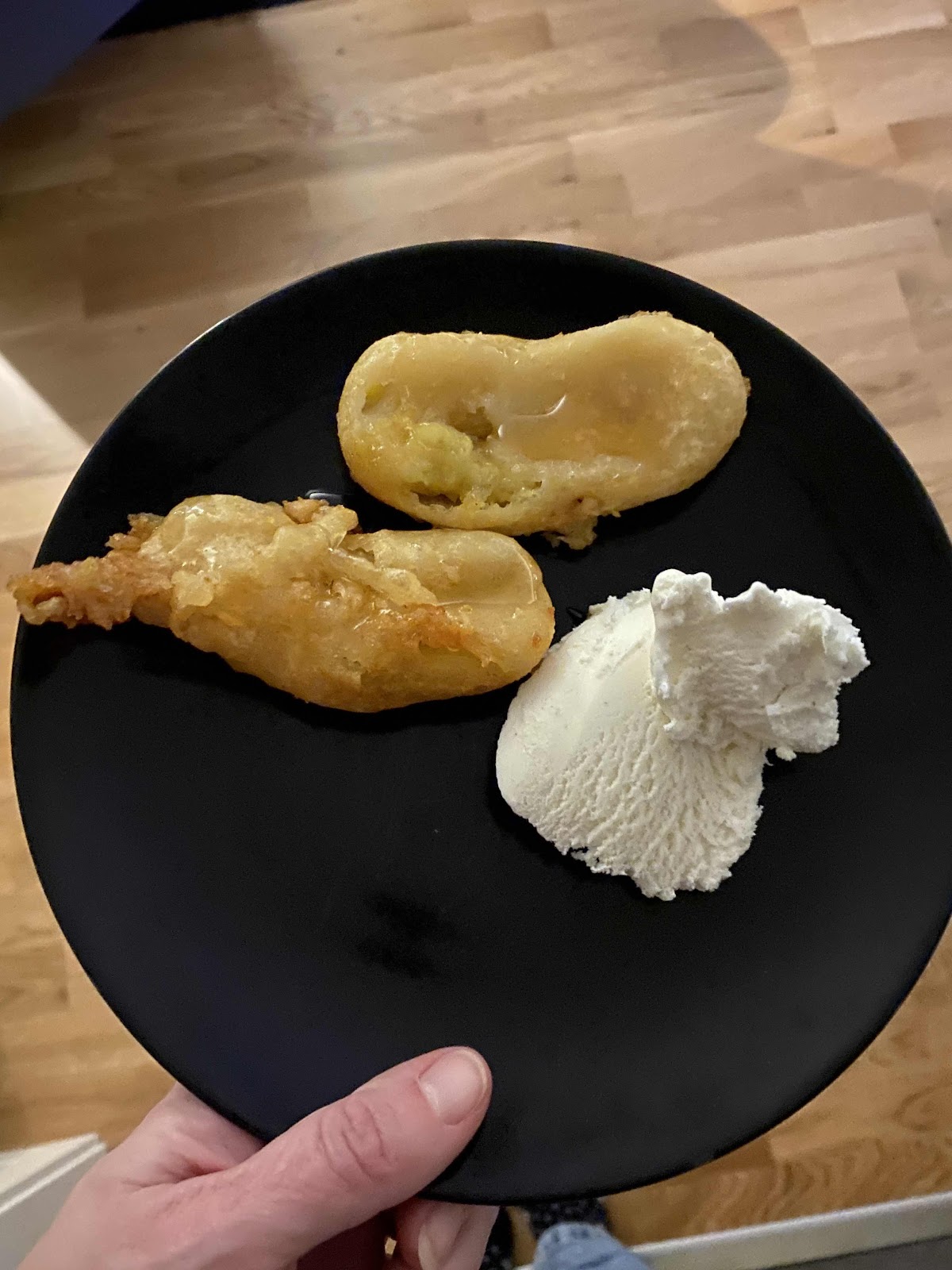 Efter kvällsmaten, ryggbiff, blev det efterrättstillverkning. Fruktsallad och glass eller friterade bananer och glass!
