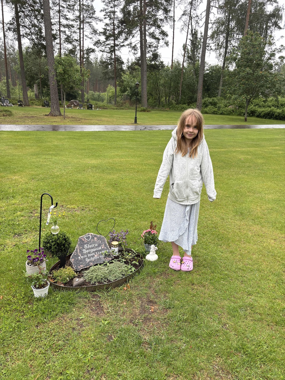 Mathilda, Jossan och tjejerna sov kvar hos oss. Penny ville upp till kyrkogården, så Oskar körde oss dit i regnet.